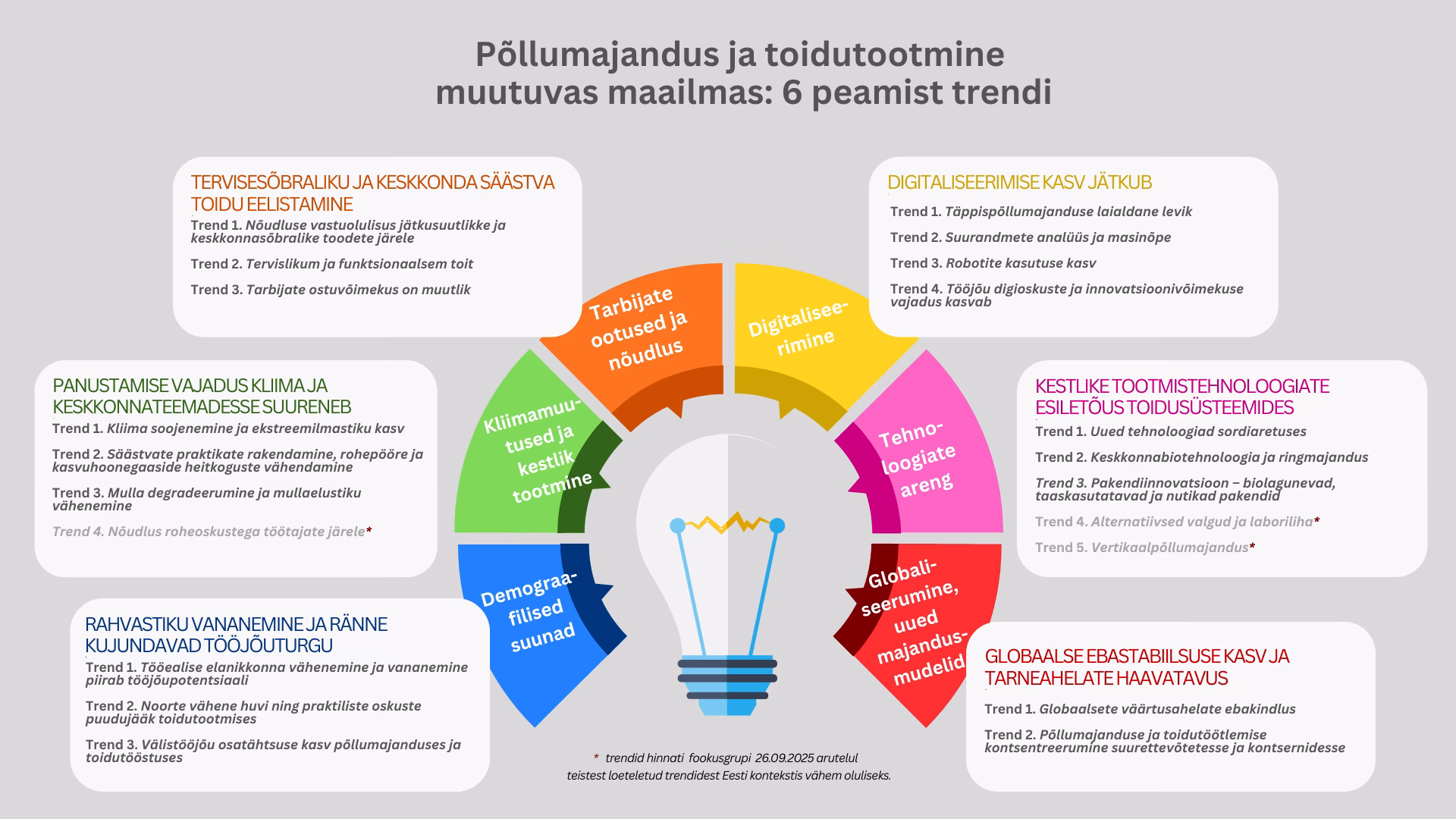 Loomse valgu asendamine- taimsed tooted ja lihaasendustooted, maheturg, mahemärgis, valgurikkad kultuurid taimekasvatuses, uued pakendi-lahendused, pakendite taas- ja korduvkasutus, pakendite toiduohutus, tarbijate hinnatundlikkus, kulusurve tootjatele- topeltväljakutsed ( keskkond vs hind).